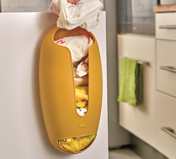 - Ein Behälter, der entwickelt wurde, um Plastiktüten, Stofftaschen oder Müllbeutel zu lagern und zu organisieren.