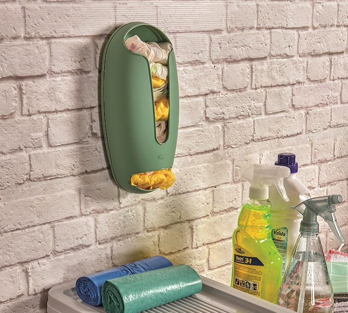 - Ein Behälter, der entwickelt wurde, um Plastiktüten, Stofftaschen oder Müllbeutel zu lagern und zu organisieren.