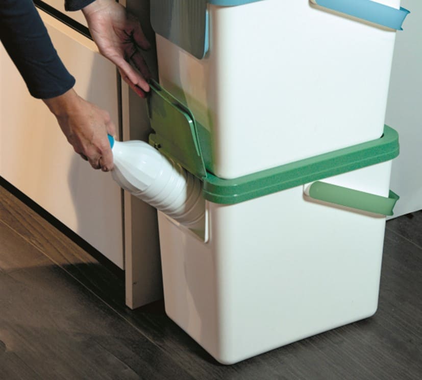 - Der Deckel ist so konzipiert, dass eine mögliche Stapelung von mehr Abfallbehältern gewährleistet ist, die große Eingangstür sorgt für eine einfache Bedienung, auch wenn Behälter gestapelt werden.