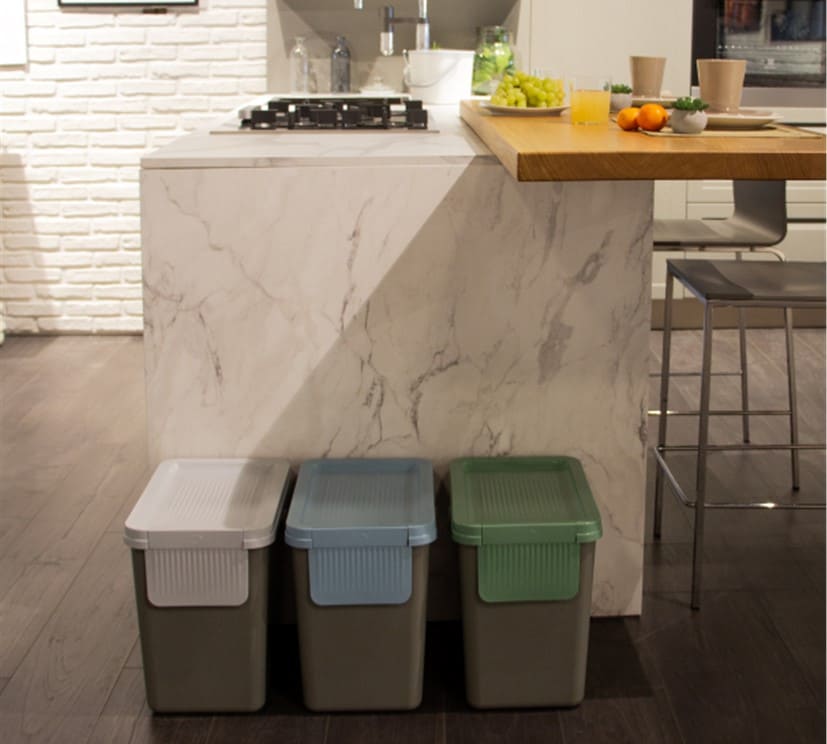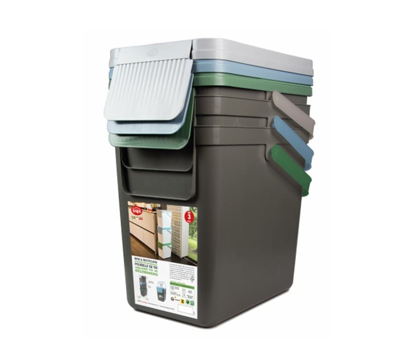 - Set von 3 Behältern (je 25 LT Fassungsvermögen), ausgestattet mit abnehmbarem Deckel, Haustür und einem praktischen Griff. Dieser Abfallbehälter für die separate Innen- und Außensammlung ist ideal für die Trennung von Abfällen: Glas, Papier und Pappe, Dosen, Kunststoff usw. Perfekt für die Organisation der separaten Sammlung von Haus oder Büro.