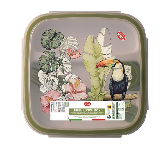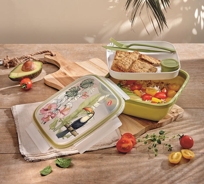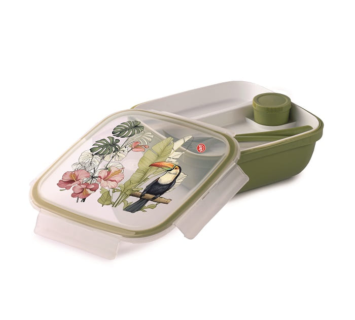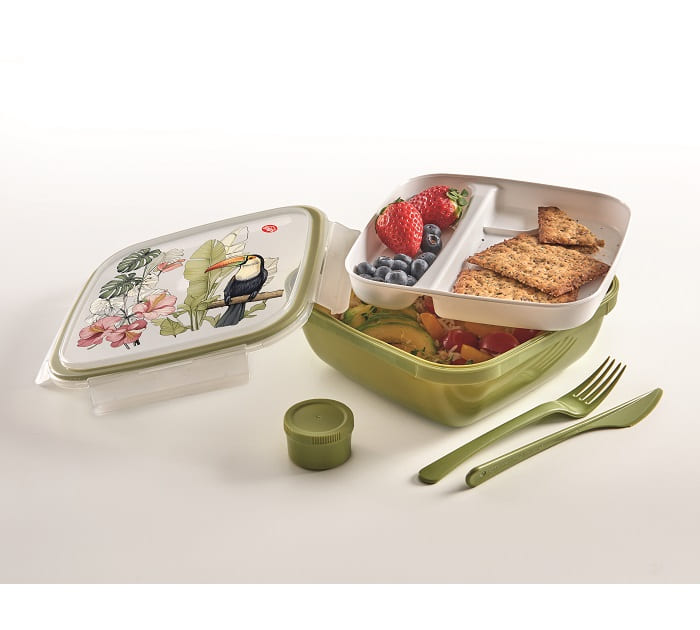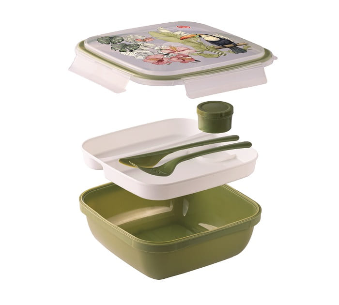 - L’ensemble se compose de: le conteneur principal, un plateau amovible avec des couverts, un couvercle avec joint étanche à l’air et une fermeture de sécurité. Les couverts et le récipient à sauce sont également inclus.