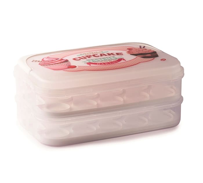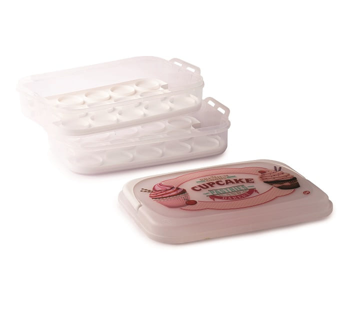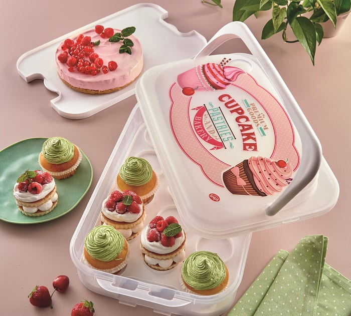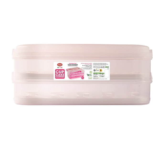 - Grâce aux plateaux réversibles et amovibles, vous pouvez transporter en toute sécurité 28 cupcakes ou muffins sur un côté. De l’autre côté, vous pouvez transporter des gâteaux jusqu’à 25 cm de diamètre.