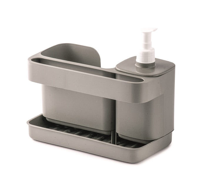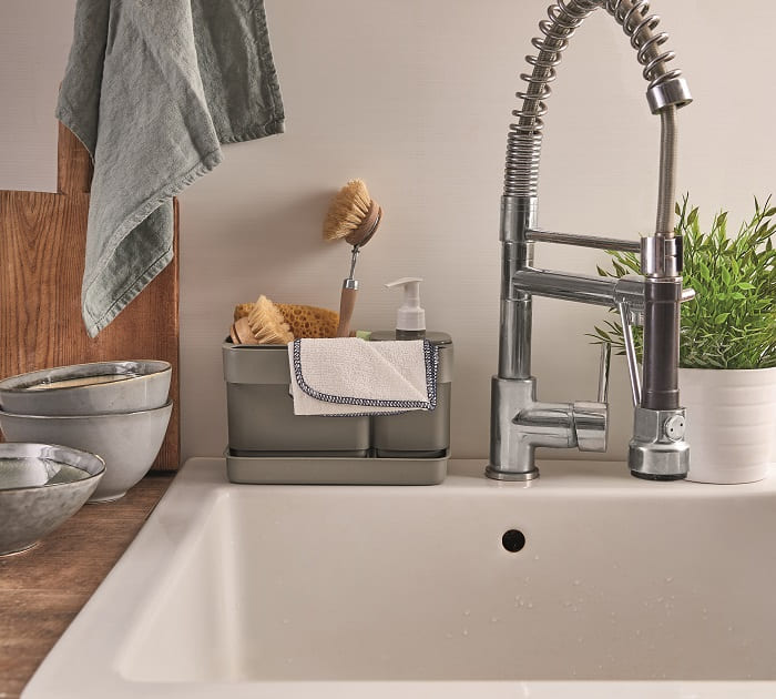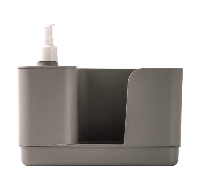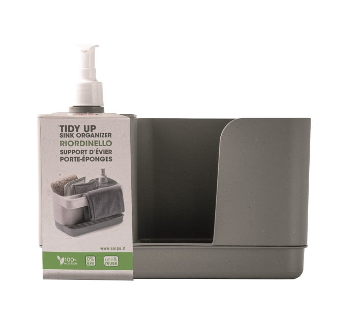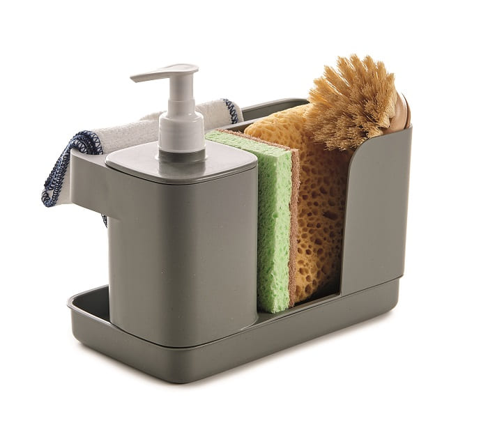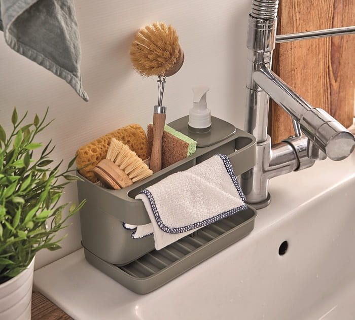 - In un unico prodotto: dispenser per sapone liquido o detersivo per i piatti, vano per spugne e guanti, supporto per panni e strofinacci.