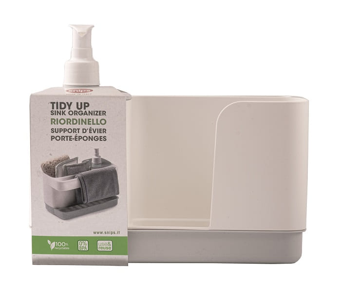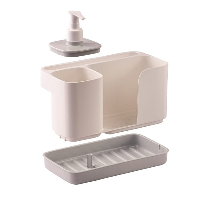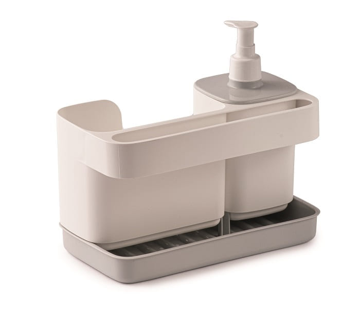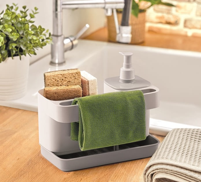 - In un unico prodotto: dispenser per sapone liquido o detersivo per i piatti, vano per spugne e guanti, supporto per panni e strofinacci.