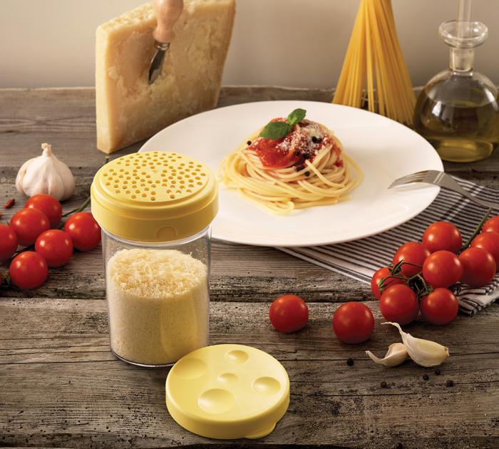 - Contenitore per spargere il formaggio grattugiato direttamente sulle pietanze. Dotato di sistema interno brevettato, per evitare la formazione di grumi.